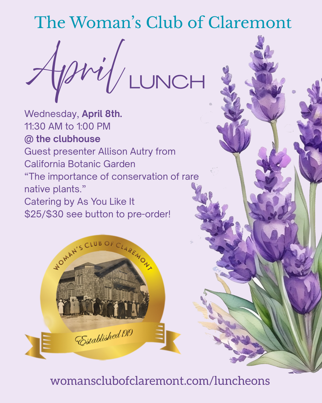 Our April 8th luncheon will feature a guest speaker from California Botanic Garden on the importance of conservation of rare native plants. We will serve a delicious catered meal from As You Like it catering. We request that guests pre-order their lunch by April 3rd to give the caterer time to prepare. To order your lunch, please CLICK HERE.