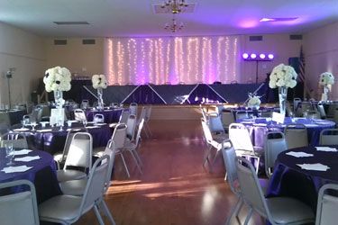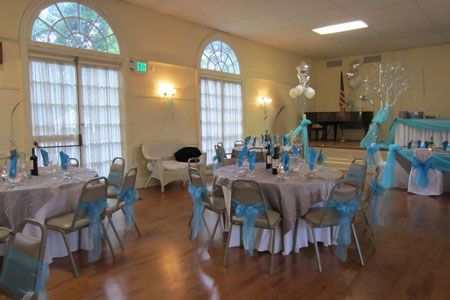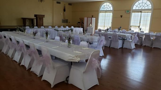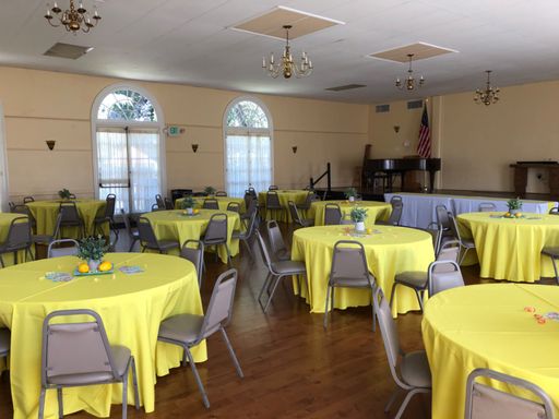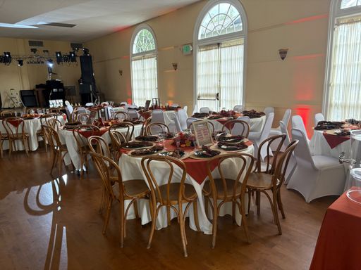 The Woman's Club historic building offers a beautiful ballroom with a hardwood floor, large stage and tall arching windows. The tables and two different types of chairs are included in your event rental.